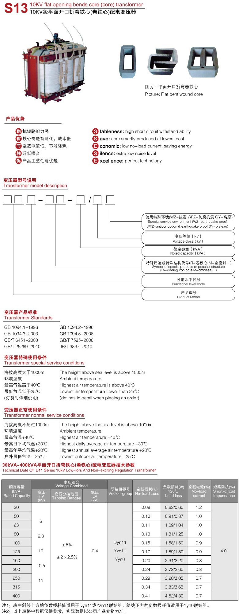S13-10KV級平面開(kāi)口折彎鐵心(卷鐵心)配電變壓器